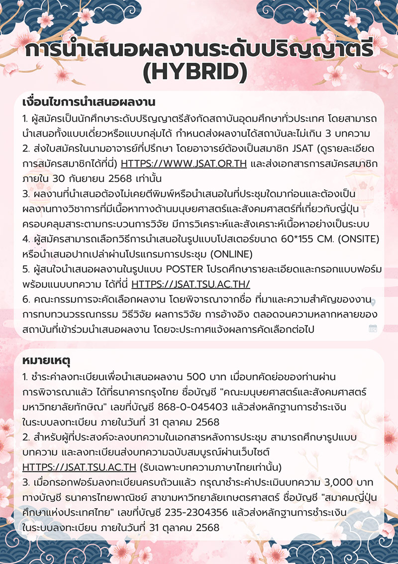 For the 2025 Annual Conference, the Faculty of Humanities and Social Sciences at Thaksin University has had the honor of being selected by the JSAT Board of Directors to host the 19th National Conference of the Japanese Studies Association of Thailand, with the main theme of "Breaking Through: Transforming Japanese Language Teaching to Address the Needs of Digital 5.0 Learners."